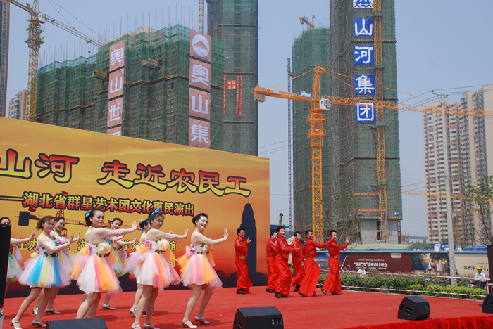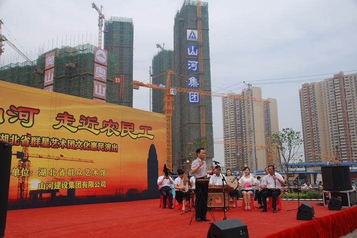 這次惠民演出是由湖北省群藝館與山河集團(tuán)共同舉辦,是山河集團(tuán)關(guān)愛農(nóng)民工的又一項(xiàng)舉措。湖北公司副總經(jīng)理柯為正在致辭中介紹說,作為房建施工總承包特級資質(zhì)企業(yè),山河集團(tuán)已發(fā)展成為投資或控股東升建設(shè)、竹安設(shè)備、益鵬置業(yè)等22家子公司,集建筑產(chǎn)業(yè)、房地產(chǎn)業(yè)、投資業(yè)務(wù)于一體的企業(yè)集團(tuán)。先后榮獲 “全國優(yōu)秀施工企業(yè)”、“全國重合同守信用企業(yè)”、“中國中部地區(qū)建筑業(yè)50強(qiáng)”,連續(xù)八年被湖北省人民政府評定為“建筑企業(yè)綜合實(shí)力20強(qiáng)”??驴傊赋?,成績的取得離不開所有曾經(jīng)和正在為公司發(fā)展而默默奮斗的廣大工友們。