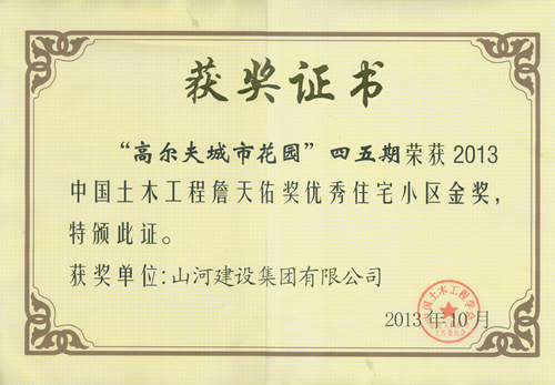 近日,由中國土木工程學(xué)會住宅工程指導(dǎo)工作委員會組織的2013年度“中國土木工程詹天佑優(yōu)秀住宅小區(qū)”頒獎儀式在北京舉行,由山河集團(tuán)承建的 “武漢高爾夫城市花園四、五期”榮獲“中國土木工程詹天佑獎優(yōu)秀住宅小區(qū)金獎”。