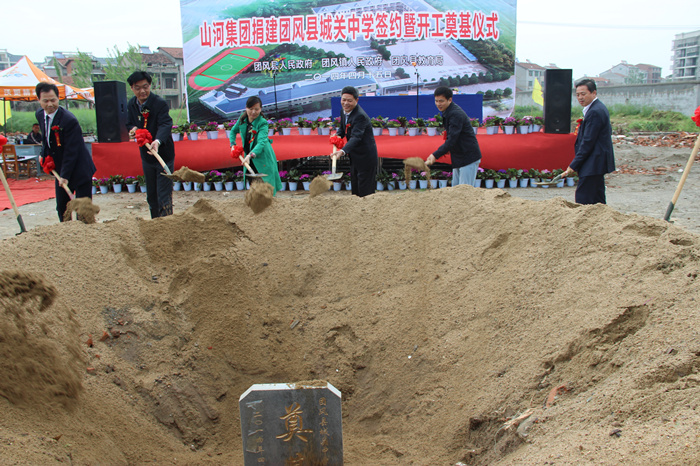 4月15日上午,山河集團(tuán)捐建團(tuán)風(fēng)縣城關(guān)中學(xué)簽約暨奠基開工儀式舉行,團(tuán)風(fēng)縣副縣長(zhǎng)黃菊花代表縣人民政府與山河集團(tuán)董事長(zhǎng)程理財(cái)簽訂了捐建協(xié)議書。