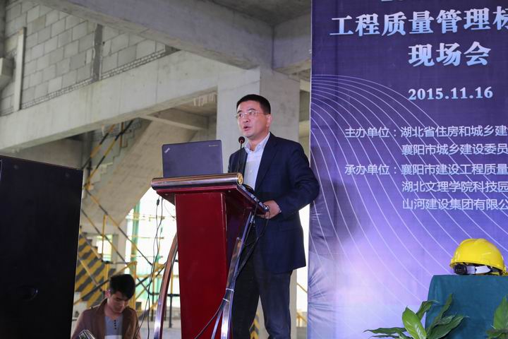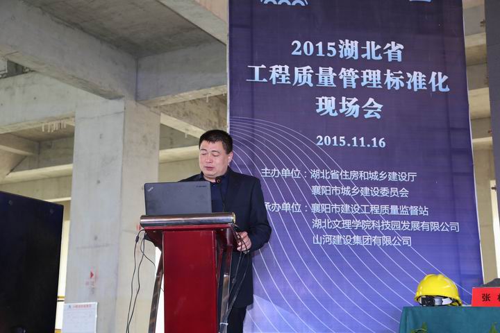 11月16日上午,湖北省工程質(zhì)量管理標準化現(xiàn)場會在湖北文理學院科技園工研院項目召開。省質(zhì)安總站副站長董文斌,襄陽市建委副主任盧一平、質(zhì)檢站黨委書記倪海青、站長張林、副站長黃先明,湖北文理學院校黨委常委副校長魏躍春,湖北文理學院科技園發(fā)展有限公司副總經(jīng)理寇國良,山河集團常務副總經(jīng)理兼湖北公司總經(jīng)理林中茂、湖北公司副總經(jīng)理羅定軍、詹必強等參加了會議。襄陽市工程質(zhì)量監(jiān)督檢查站站長張林主持會議。