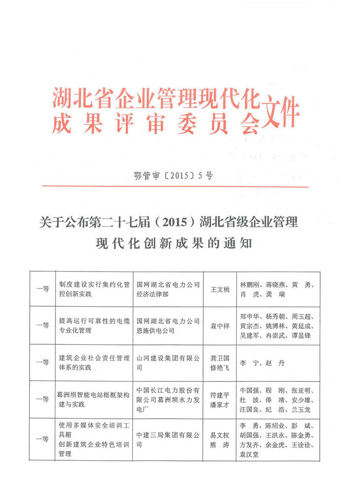 2015年12月25日,湖北省第二十七屆(2015)企業(yè)管理現(xiàn)代化創(chuàng)新成果名單公布,山河集團(tuán)申報(bào)的《建筑企業(yè)社會(huì)責(zé)任管理體系的實(shí)踐》成果榮獲一等獎(jiǎng)。