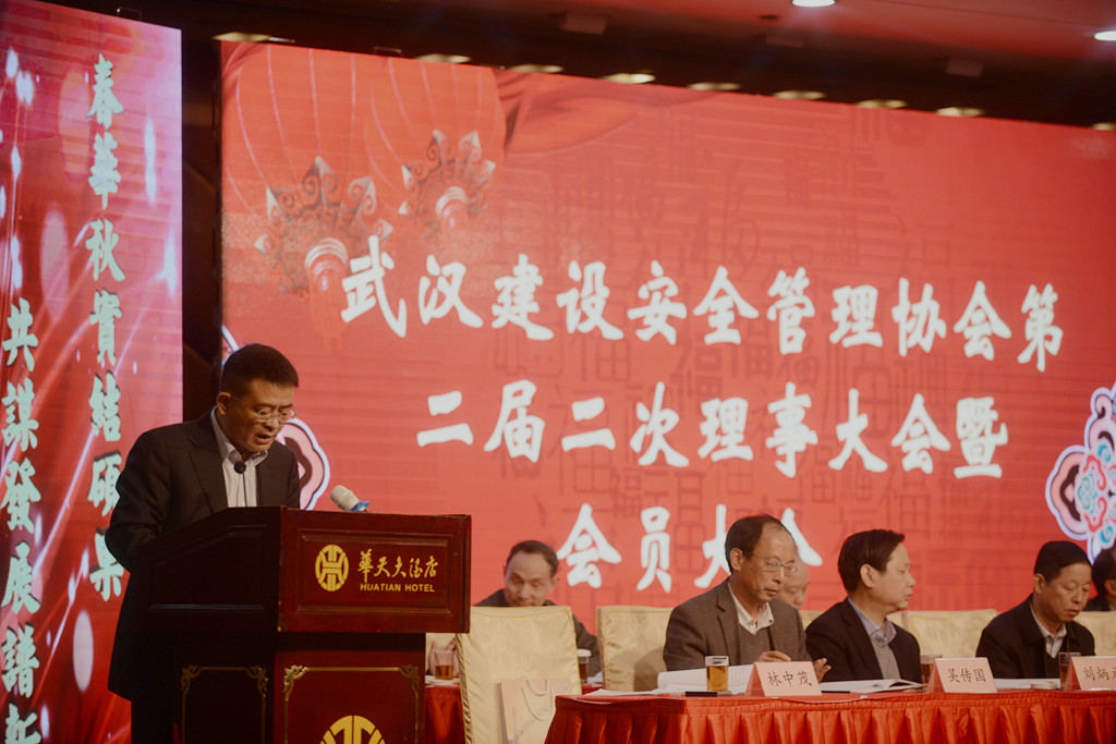 武漢市建筑安全協(xié)會副會長、山河集團常務副總經(jīng)理林中茂主持會議。武漢市建委副主任夏平,市民政局處長張福先,市建委質(zhì)安處處長謝衛(wèi)華,市安全監(jiān)管站站長熊付剛、書記王偉震、副站長周捍東,市安全協(xié)會應志剛等領導及在漢建筑施工單位參會代表共計400余人參加此次會議。