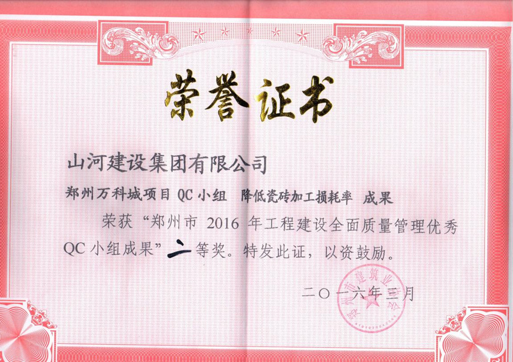 近日,2016年鄭州市優(yōu)秀QC小組成果評(píng)選結(jié)果揭曉。經(jīng)專(zhuān)家評(píng)審,由山河集團(tuán)鄭州萬(wàn)科城項(xiàng)目QC小組編寫(xiě)的《降低瓷磚加工損耗率》成果榮獲“鄭州市2016年工程建設(shè)全面質(zhì)量管理優(yōu)秀QC小組成果”二等獎(jiǎng)。