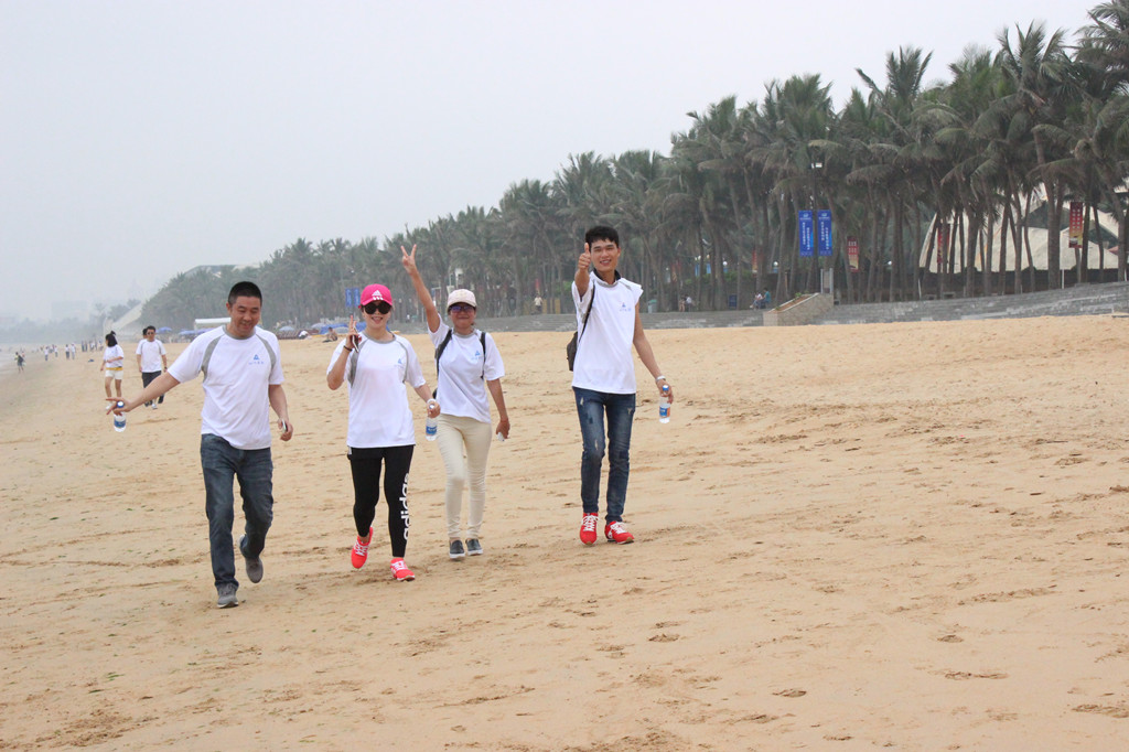活動當(dāng)天,碧海藍(lán)天微風(fēng)輕拂,參加徒步的員工一早便來到集合地點(diǎn),海南公司活動線路設(shè)置在海口西秀海灘至貴族游艇會,全程路段以沙灘為主。海南公司、??诤阏龑?shí)業(yè)公司及各項(xiàng)目部代表共計(jì)50人參加了徒步行的活動,比賽共分為15組,每個(gè)小組三人,其中有一名隊(duì)員必須是異性。為體現(xiàn)山河大家庭的氛圍,公司人員全部與項(xiàng)目部人員混編組隊(duì)。