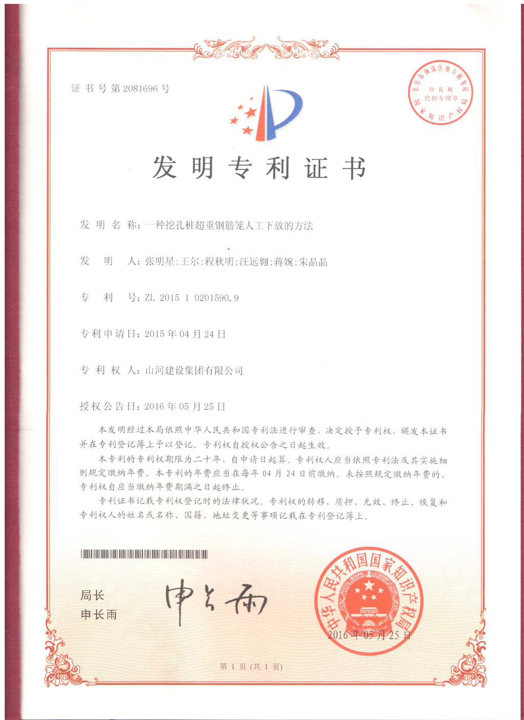 7月4日,山河集團技術發(fā)展中心研發(fā)的“一種挖孔樁超重鋼筋籠人工下放的方法”獲得由國家知識產權局授權的發(fā)明專利(專利號:ZL201510201590.9)。這是繼去年獲得一項發(fā)明專利后,山河集團再一次獲得發(fā)明專利,實現(xiàn)了科技的進步與技術的創(chuàng)新。