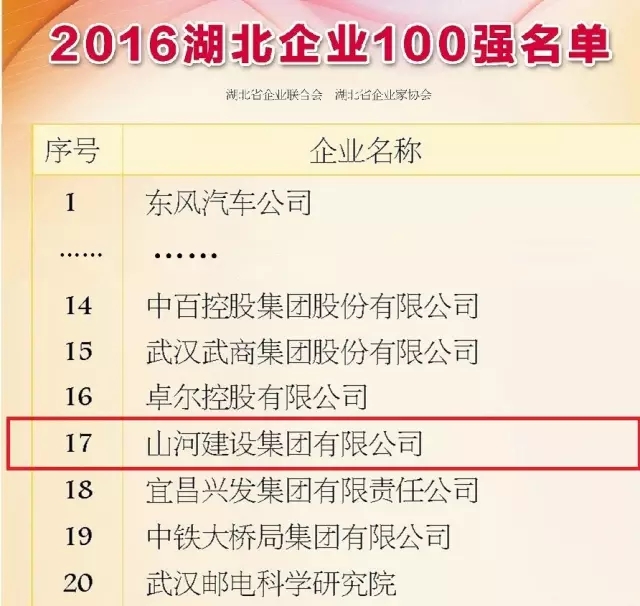 9月8日,2016湖北企業(yè)100強發(fā)布,東風(fēng)汽車、中建三局、武鋼集團(tuán)位居前三甲,山河集團(tuán)以304.85億元的營業(yè)收入排名第17位,榮登湖北企業(yè)百強榜。