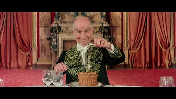 回到電影本身,每天都能到各種地方胡吃海喝的主編,被菲奈斯這個小老頭演繹的生靈活現(xiàn),即便對快餐嗤之以鼻,但是幽默的法國人也是以一種獨有的黑色幽默方式講述了那個年代快餐文化對傳統(tǒng)美食文化的沖擊與看法。影片最后的點睛之筆令人深思:清晨,小老頭與往常一樣,端坐在餐桌前,心情愉悅的切開剛剛烘焙好的新鮮糕點,里面卻突然出現(xiàn)了一支懷表,影片至此戛然而止,或許是預(yù)示著快餐時代會隨著時間的浪潮到來,無法阻擋吧。