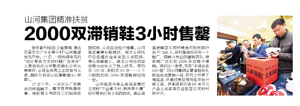 “千企幫千村“山河集團(tuán)率先行動(dòng)。11月17日,一場(chǎng)熱鬧非凡的“結(jié)對(duì)幫扶百丈河村鞋廠去庫存”義賣活動(dòng)在山河集團(tuán)湖北公司大樓舉行,公司全體員工主動(dòng)參與義賣,踴躍為貧困區(qū)奉獻(xiàn)愛心。