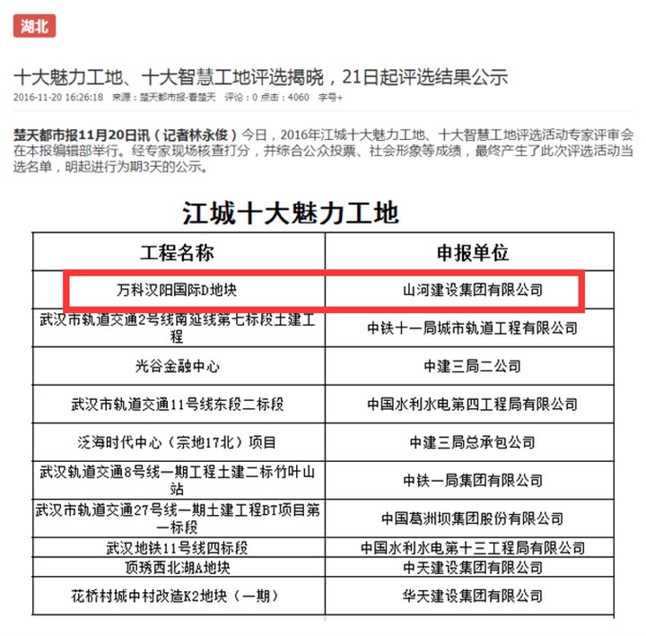 [湖北公司]山河集團”萬科漢陽國際”項目部榮獲江城十大魅力工地稱號