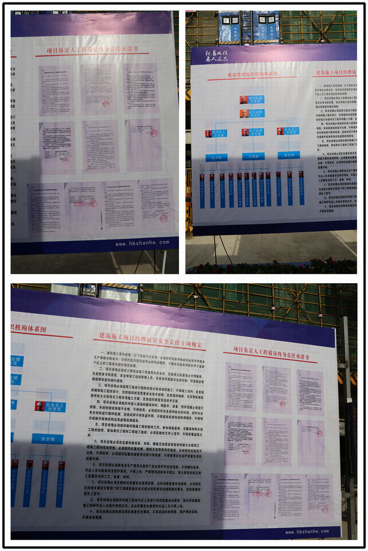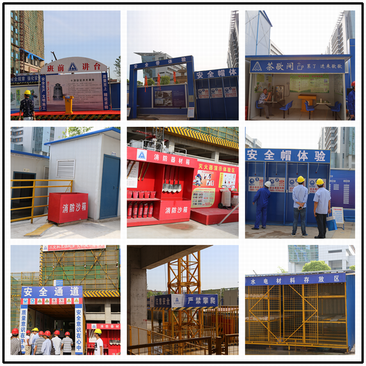 堅持安全文明施工標準化,辦公區(qū)、生活區(qū)、施工區(qū)布置三區(qū)分離,施工現(xiàn)場大門設(shè)置人行通道,保證人車分流;在進場大門左側(cè)醒目位置設(shè)置“九牌三圖”,發(fā)揮班前講臺作用,每天清晨宣貫工作作業(yè)相關(guān)注意事項,項目組織機構(gòu)及五方責(zé)任承諾公示、門衛(wèi)打卡、視頻監(jiān)控、車輛沖洗、場區(qū)降塵、重大危險源公示欄等嚴格執(zhí)行標準。