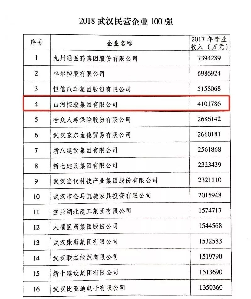 2018武漢民企100強榜單出爐! 山河控股集團位列第4位