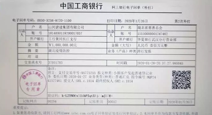 1月26日,山河集團(tuán)通過(guò)湖北省慈善總會(huì)捐贈(zèng)100萬(wàn)元人民幣,全力支持黃岡地區(qū)的疫情防控工作。根據(jù)疫區(qū)前線的需求,用于采購(gòu)防護(hù)服、口罩、消毒液等醫(yī)療防護(hù)用品,為醫(yī)務(wù)人員提供幫助和支持。
