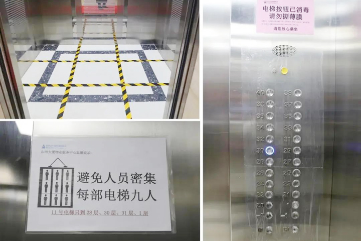 物業(yè)服務中心加強對進出車輛的管控,大廈地庫通往寫字樓的進出口暫時封閉,所有人員均須經大堂出入,同時出入口分開設置。大廈一樓開辟了快遞外賣自提區(qū),減少人員近距離接觸,電梯實行“分區(qū)分層”管控,嚴格限制搭乘人數,轎廂每小時固定消毒,規(guī)避潛在的交叉感染可能。