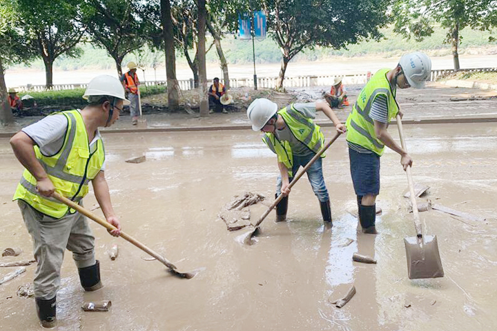 8月19日至20日,“長江2020年第5號洪水”“嘉陵江2020年第2號洪水”陸續(xù)通過重慶主城區(qū),巴南區(qū)魚洞江濱路、巴濱路、木洞、李家沱等低洼地區(qū)受災(zāi)嚴重。山河建設(shè)集團西南公司碧桂園巴南工貿(mào)園項目部主動請纓,組織管理人員及工人成立了一支道路清淤志愿隊,積極投入到救災(zāi)工作中。