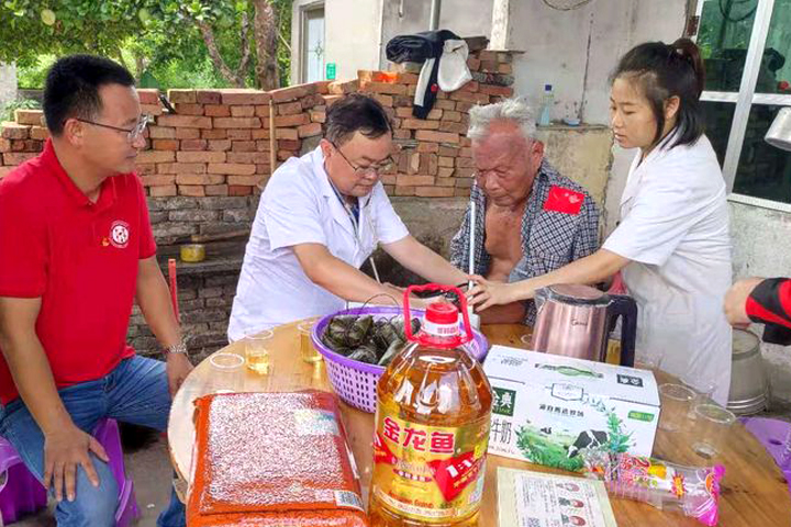 活動中,海南省湖北商會儋州分會黨支部書記、山河建設(shè)集團(tuán)海南?;◢u項(xiàng)目部黨支部書記童學(xué)軍帶隊(duì)走訪了5名黨齡超過50年的老黨員、5名生活困難的黨員,為他們送去慰問金及米、油、牛奶、蘄艾眼貼等慰問品,還帶著醫(yī)生上門服務(wù),為他們進(jìn)行了健康體檢。走訪中,黨員、職工和老黨員親切交流,仔細(xì)詢問了他們的生活、身體狀況,叮囑他們要保重身體,安享晚年。