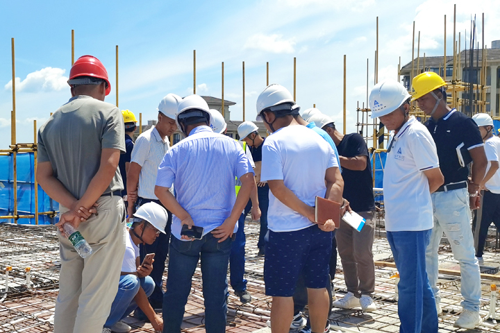 接下來,參訓人員前往施工現(xiàn)場參觀操作層,實地了解了裝配式疊合板施工的工藝流程,技術(shù)人員對安裝過程中的關(guān)鍵點一一進行了講解。交流環(huán)節(jié),大家就供應(yīng)商的考察選擇、總體施工安排、施工工藝重難點、安全文明施工要求、工效及實際操作等方面進行了熱烈討論。