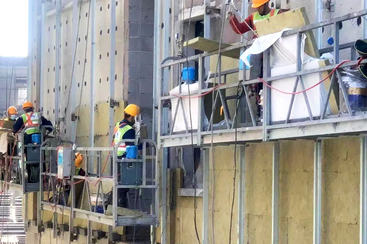 ▲天津華測儀器儀表制造項目工人在進(jìn)行外墻施工