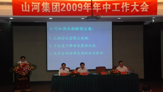 2009年9月19日-20日,山河集團(tuán)2009年年中大會在江西廬山西海度假村會議中心召開。集團(tuán)公司董事長程理財(cái)、黨委書記舒先厚、總經(jīng)理黃林以及各黨委副書記、副總經(jīng)理、三總師和集團(tuán)公司辦公人員、區(qū)域公司及子公司主要負(fù)責(zé)人、集團(tuán)公司項(xiàng)目經(jīng)理近兩百人齊聚一堂,共商山河發(fā)展大計(jì)。